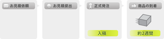 - 正式発注後、約2週間が納品の目安です。入稿データはなるべく早めにお送り頂けると製作がスムーズです。